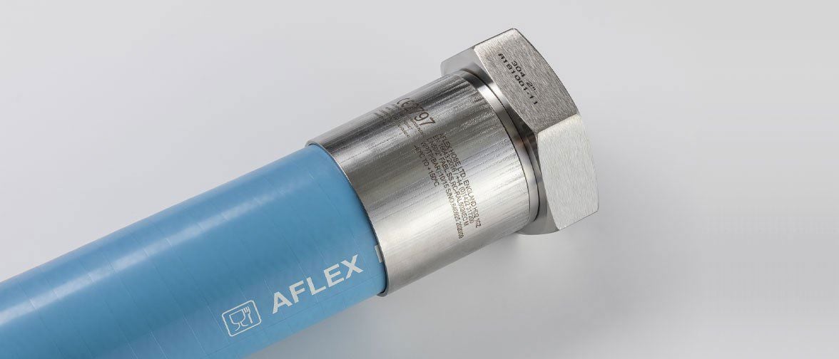 1” PTFE lined PN10 flange spigots on heated hoses can only have a maximum flare diameter of 50mm, not 63mm. If the hose is “hanging”, straight or at 90˚, under its own weight, special construction is required, so advise Aflex Hose accordingly. Minimum ETH Hose assembly length, when collars are used 1mtr.