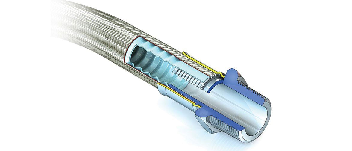 Visiflon is a fully convoluted PTFE-lined hose product, used in applications where excellent flexibility is required, and the convoluted bore is not a disadvantage.