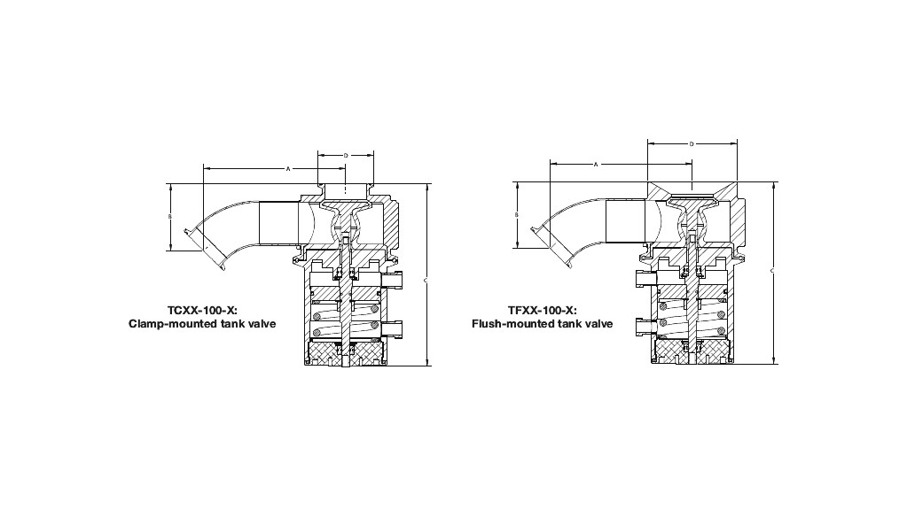 2.0 TF20-100 Radial valve , 2" Flush Tank, EN 1.4435 body/316L fitting(s), Fits 0.375" thick or less head, 2" 45̊ clamp-end outlet, flush diaphragm, (unground weld(s), weld is polished to match interior finish), x micro-inch Ra surface finish, electropolished and passivated, includes body/actuator clamp