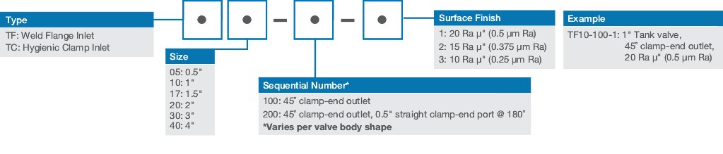 1.0 TF10-100 Radial valve ,1" Flush Tank, EN 1.4435 body/316L fitting(s), Fits 0.375" thick or less head, 1" 45̊ clamp-end outlet, flush diaphragm, (unground weld(s), weld is polished to match interior finish), x micro-inch Ra surface finish, electropolished and passivated, includes body/actuator clamp