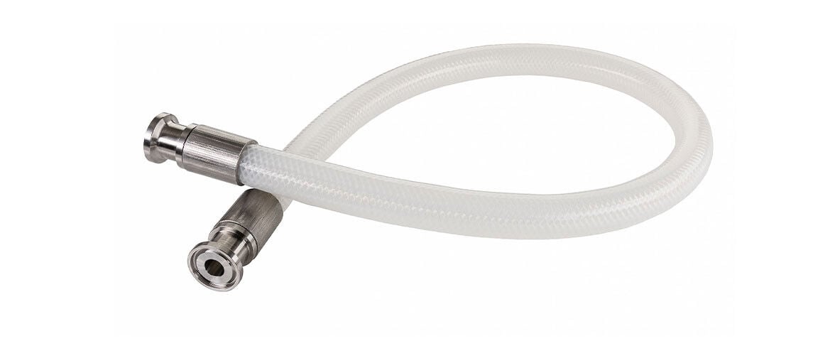Providing a safe and reliable method of high-pressure fluid transfer, braided silicone hose assemblies combine platinum-cured silicone hose fitted with biopharmaceutical grade stainless steel tri-clamp connections. Assemblies are made to custom lengths and are provided with a permanently crimped stainless steel tri-clamp style fittings. All hose assemblies are pressure tested to check and confirm hose integrity. These lightweight flexible hoses can be provided with optional laser marking on the stainless ferrule and/or FEP encapsulated tagging.