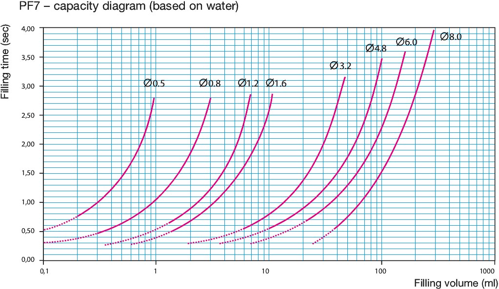 Fill volume / ml Bore / mm (in) Typical fill time / s