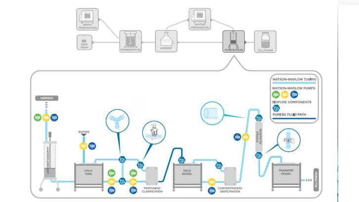 Watson-Marlow pumps are suitable for a range of purification processes — clarification, concentration, including ultrafiltration, diafiltration and chromatography. Our suite of peristaltic pumps meets a range of requirements from benchtop applications to full production. Functionality suits process needs and supports full integration with other process equipment. This allows you complete process scaling, using the same technology and validation throughout.